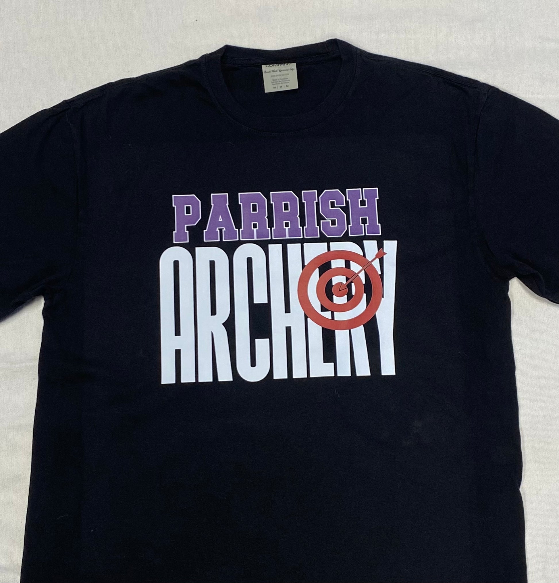 Black Short Sleeve Gildan 50/50 blend tshirt with Parrish Archery on front.